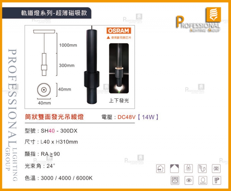 SH40-300DX 超薄款磁吸 筒狀雙面發光吊線燈
