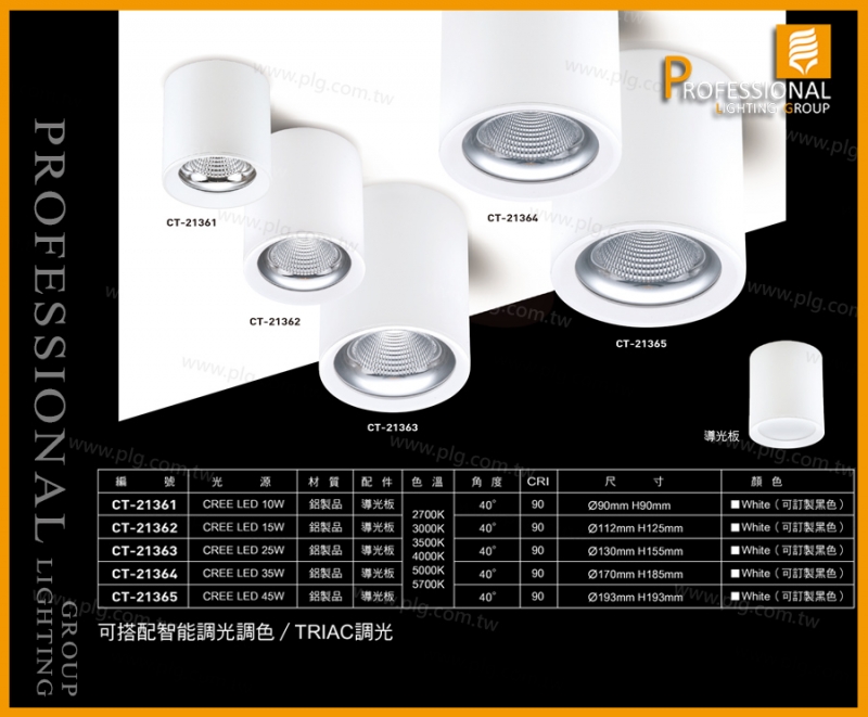 CT-21361、CT-21362、CT-21363、CT-21364、CT-21365 吸頂燈 CT-21361 光源:CREE LED 10W 尺寸:Ø90mm H90mm CT-21362 光源:CREE LED 15W 尺寸:Ø112mm H125mm CT-21363 光源:CREE LED 25W 尺寸:Ø130mm H155mm CT-21364 光源:CREE LED 35W 尺寸:Ø170mm H185mm CT-21365 光源:CREE LED 45W 尺寸:Ø193mm H193mm 材質:鋁製品 配件:導光板 色溫:2700K/3000K/3500K/4000K/5000K/5700K 角度:40° CRI:90 顏色:White |