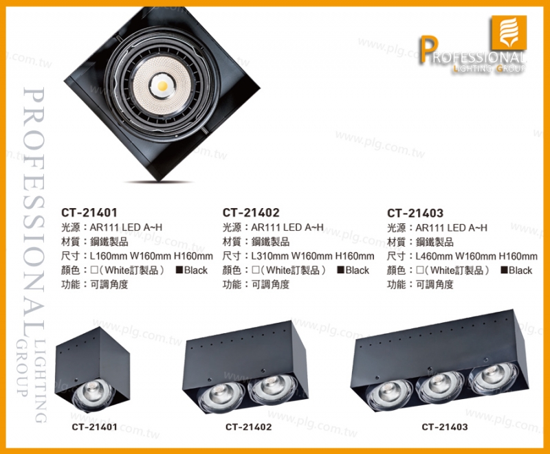 CT-21401、CT-21402、CT-21403 吸頂燈 CT-21401 光源:AR111 LED A~H 材質:鋼鐵製品 尺寸:L160mm W160mm H160mm*燈具高度不含光源 顏色:White(訂製品)/Black 功能:可調角度 CT-21402 光源:AR111 LED A~H 材質:鋼鐵製品 尺寸:L310mm W160mm H160mm*燈具高度不含光源 顏色:White(訂製品)/Black 功能:可調角度 CT-21403 光源:AR111 LED A~H 材質:鋼鐵製品 尺寸:L460mm W160mm H160mm*燈具高度不含光源 顏色:White(訂製品)/Black 功能:可調角度 **光源款式在備註頁** |